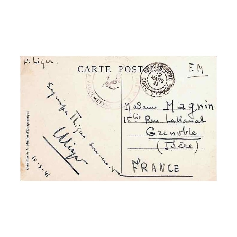 • 1941 Carte postale en FM Oblitération OUAGADOUGOU COTE D'IVOIRE