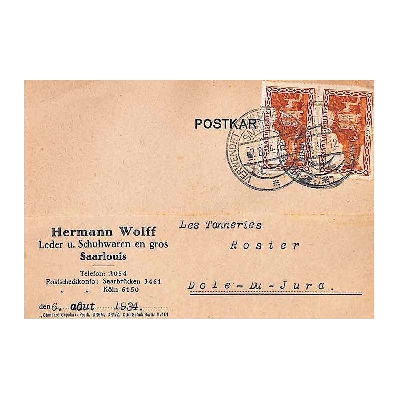 Carte postale 1934 Affranchissement 109 (x2) Oblitération VERWENDET WOHLFAHRTS BRIEFMARKEN / SAARLOUIS *