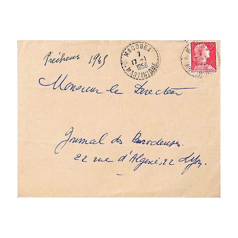 Lettre (léger défaut) 1956 Affranchissement France Oblitération MACOUBA MARTINIQUE