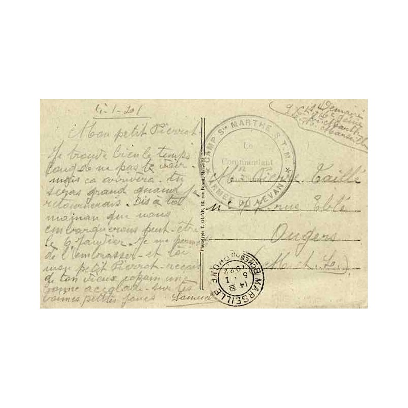 Carte postale en franchise militaire Cachet noir CAMP Ste MARTHE S.T.M. * ARMEE DU LEVANT * Le Commandant du Camp 1922