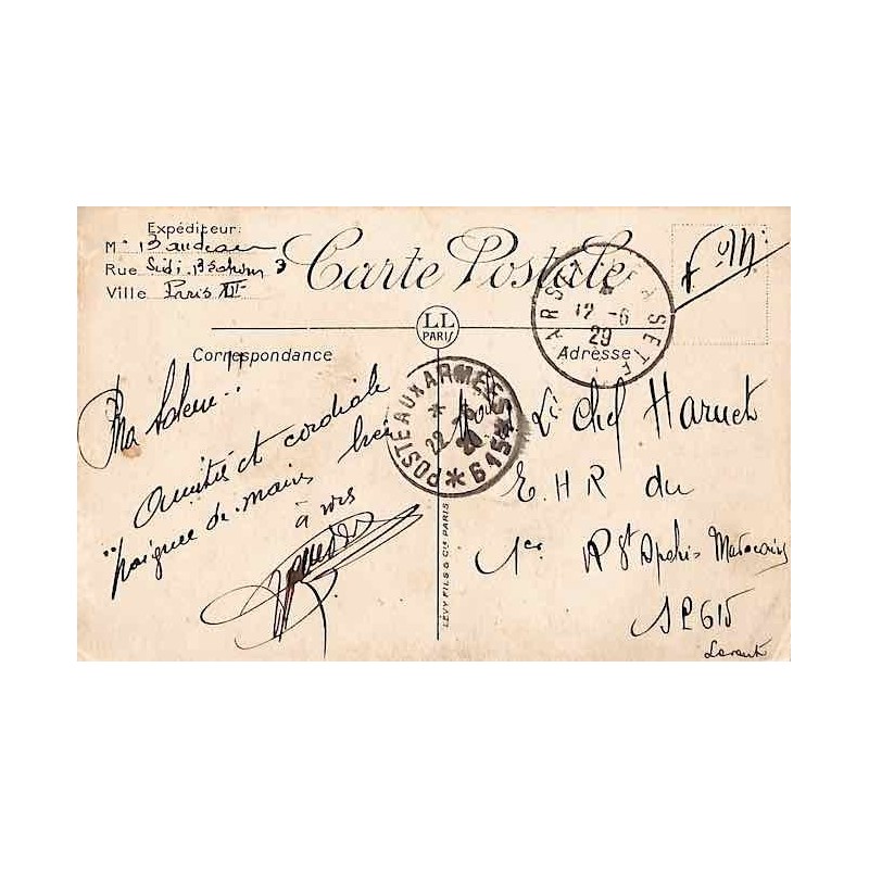 Carte postale en franchise militaire 1929 Timbre à date POSTE AUX ARMEES * 615 * (Alep)