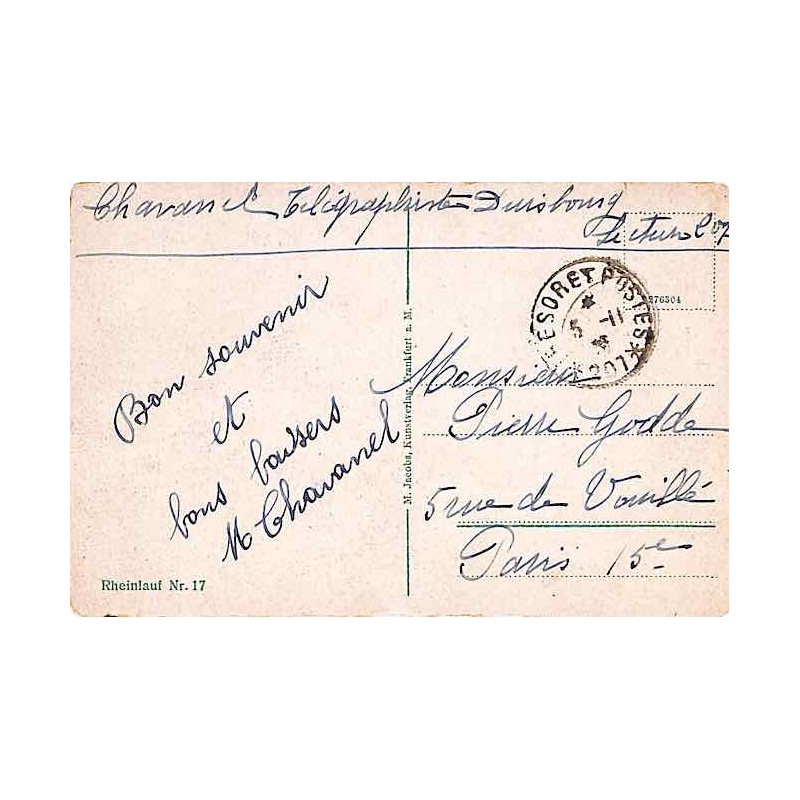 Carte postale en FM datée de Duisbourg 1925 Timbre à date TRESOR ET POSTES * 207 *
