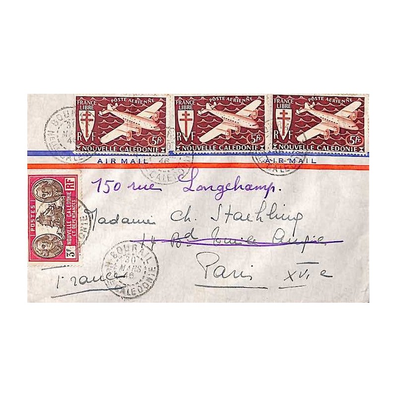 Enveloppe avion 1946 Affranchissement 158, PA 8 (x3) Oblitération BOURRAIL NELLE CALEDONIE