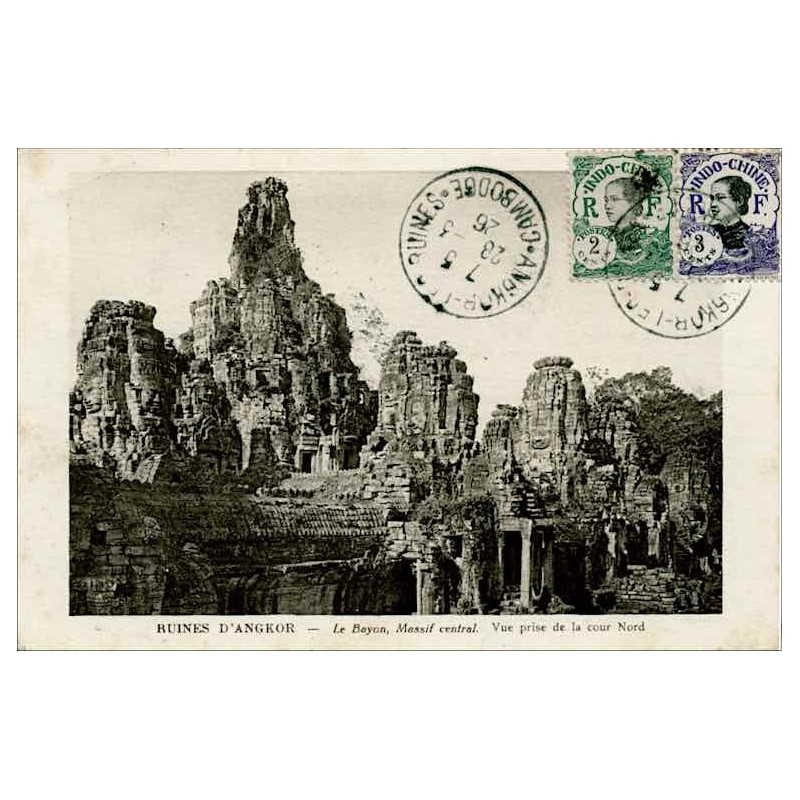 Carte postale du Bayon d'Angkor 1926 Aff. Indochine 101, 102 Cachet à date ANGKOR - LES - RUINES CAMBODGE
