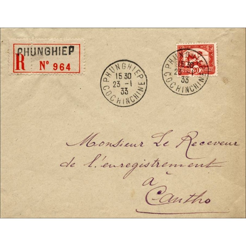 Enveloppe recommandée 1933 Affranchissement 163 Oblitération timbre à date PHUNGHIEP COCHINCHINE