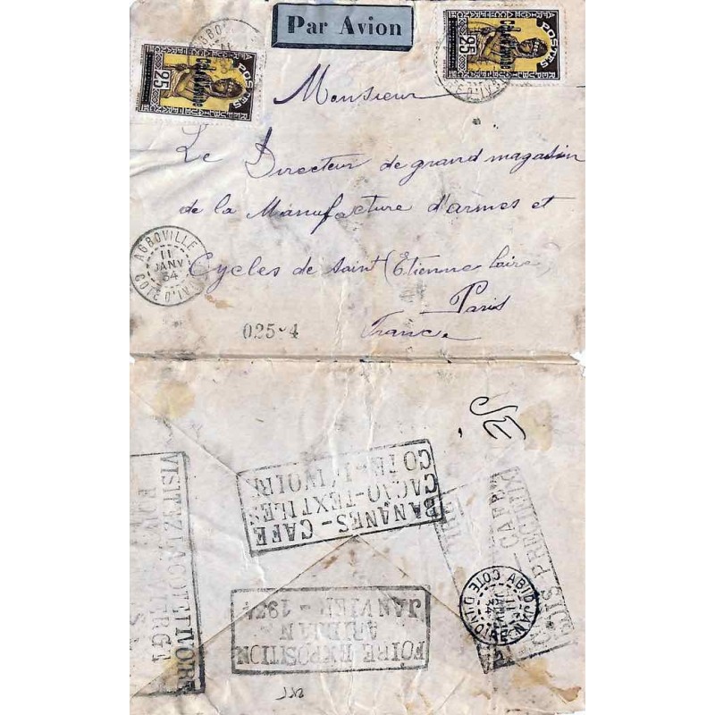 Lettre avion (def.) 1934 Affranchissement 94 (x2) Oblitération AGBOVILLE COTE D' IVOIRE Cachets de propagande divers au verso