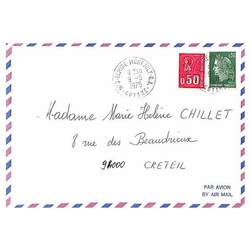 Enveloppe avion 1975 Affranchissement France Oblitération 973 - REMIRE-MONTJOLY-G.A. - GUYANE -