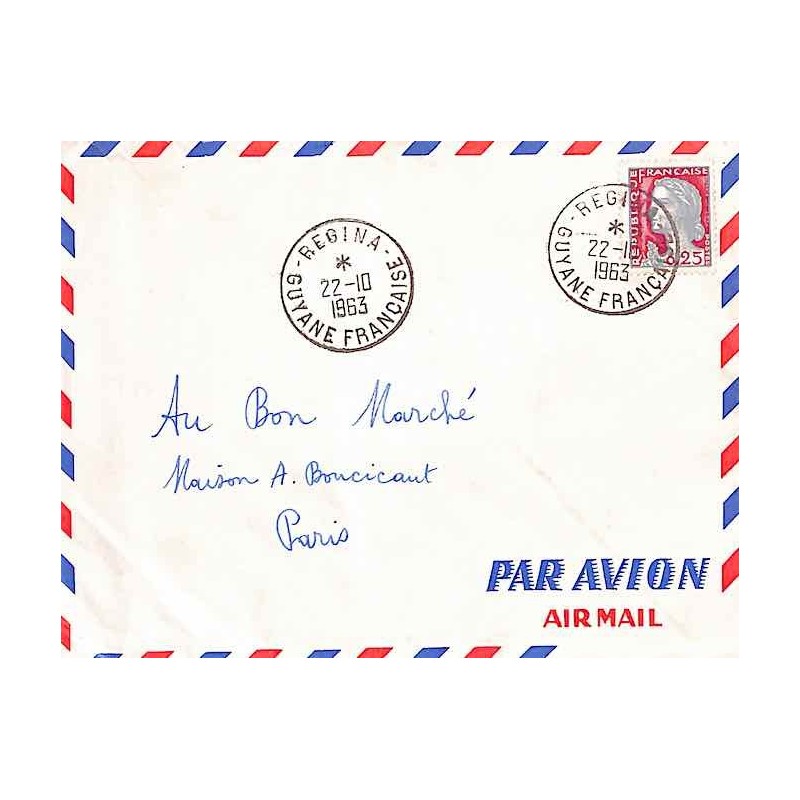 Enveloppe avion Affranchissement France Oblitération REGINA . GUYANE FRANCAISE . 1967