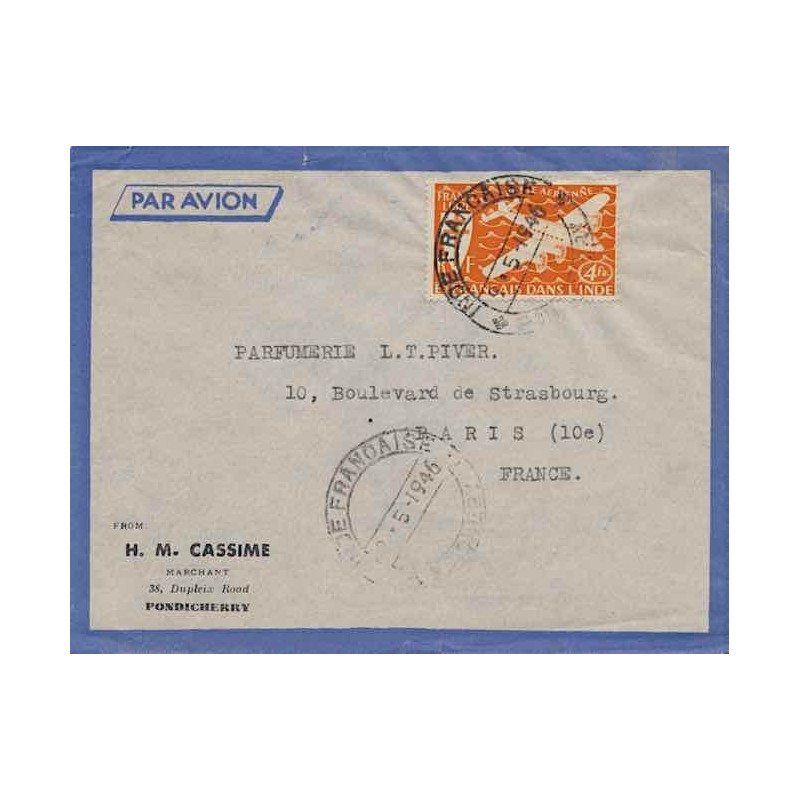 Env avion 1946 Affranchissement Inde PA 1 Tad INDE FRANCAISE * PONDICHERY *
