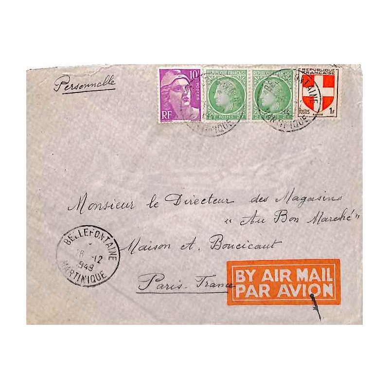 Lettre par avion Oblitération BELLEFONTAINE MARTINIQUE 1949