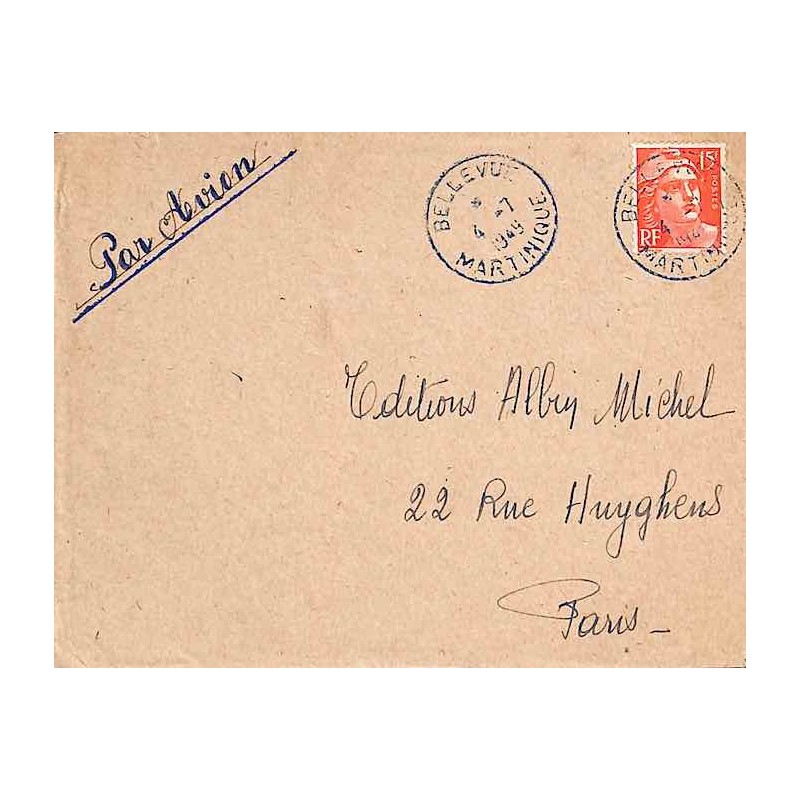 Lettre par avion (léger défaut) Oblitération bleue BELLEVUE MARTINIQUE 1949