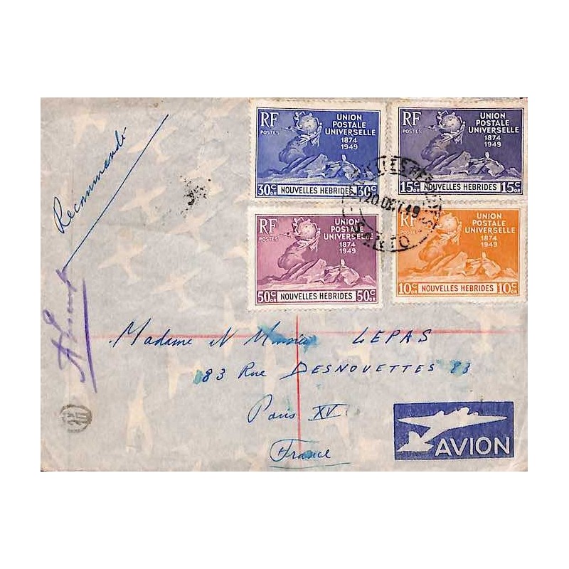 Enveloppe avion recommandée 1949 Affranchissement 136 à 139 Oblitération NOUVELLES HEBRIDES - SANTO -