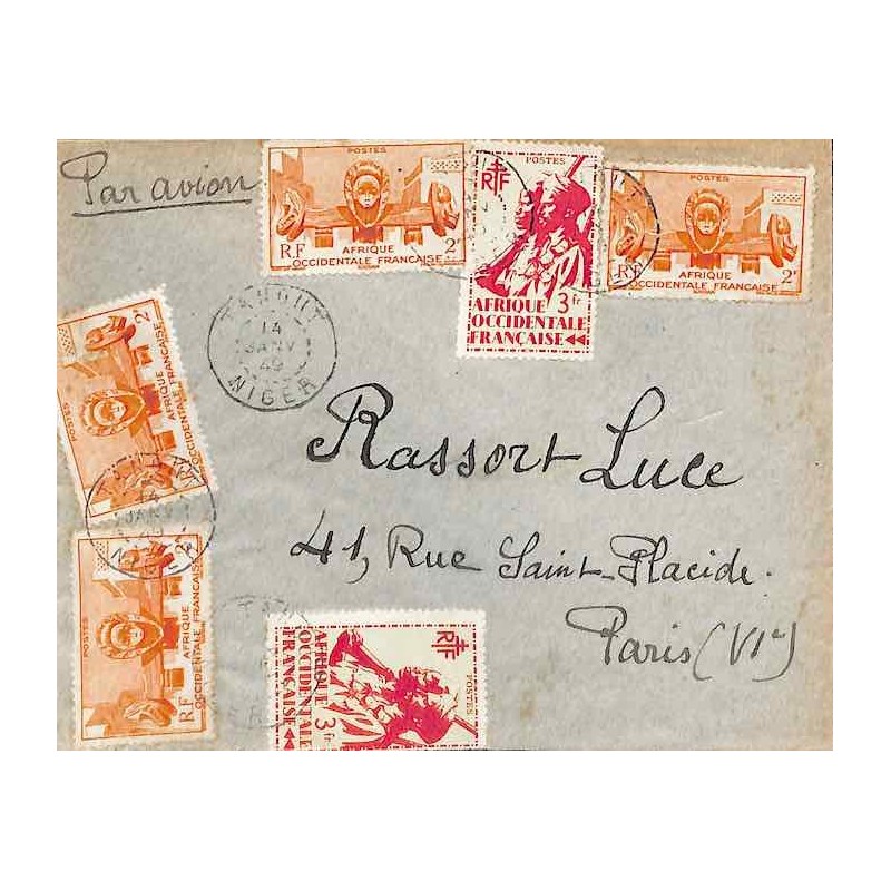 Lettre avion 1949 Affranchissement à 10 F. Aof 16 (x2), 33 (x4) Oblitération TANOUT NIGER