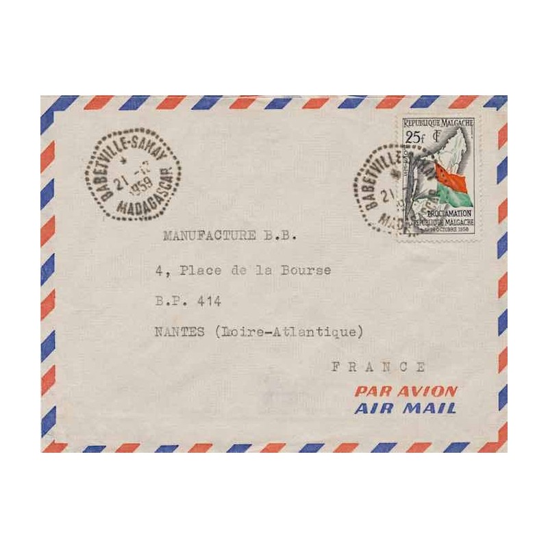 Lettre avion 1959 Affranchissement 339 Oblitération BABETVILLE - SAHAY MADAGASCAR Agence postale