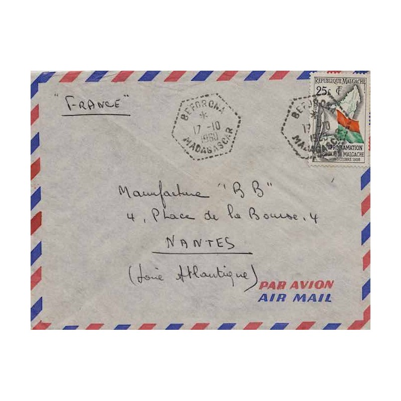 Lettre par avion 1960 Affranchissement 339 Oblitération BEFORONA MADAGASCAR Agence postale
