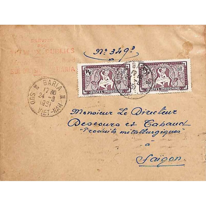Enveloppe (pd) officielle 1951 Affranchissement 168 (x 2) Oblitération BARIA * SUD VIET-NAM *