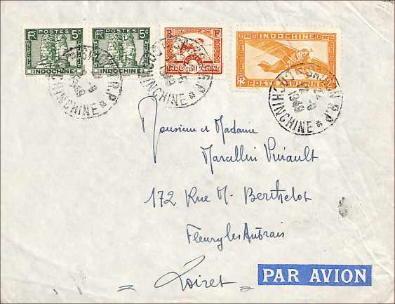 INDO1055 Lettre (pd) avion pour la France 1949 Affranchissement à 5 $ 80 par 169 (x2), PA 11 (x2) Oblitération SAIGON RP - SUD VIETNAM - : € 3