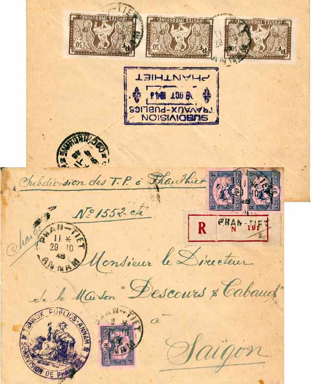 INDO1061 Enveloppe de service recommandée pour Saigon 1948 Affranchissement à 1 $ 80 par 216 (x3) et au verso 167 (x3) Oblitération PHAN-TIET ANNAM : € 10