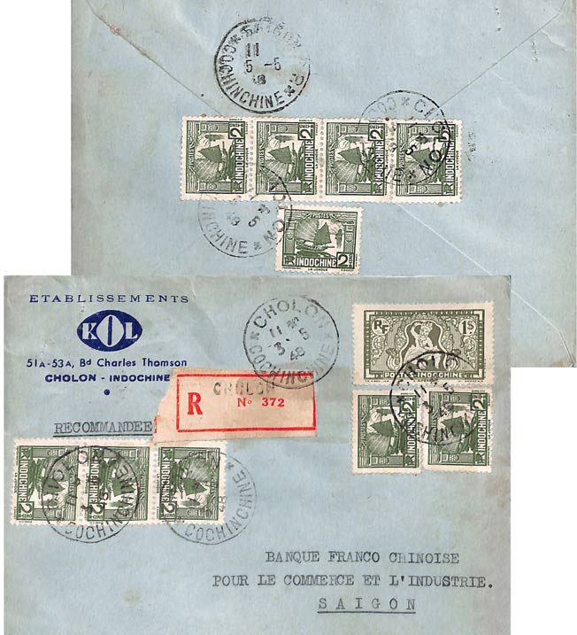 INDO1068 Lettre rec intérieure 3-5-1948 Affranchissement à 2 $ par 155 (x5 et x5 au verso) 169 Oblitération CHOLON * COCHINCHINE * : € 6