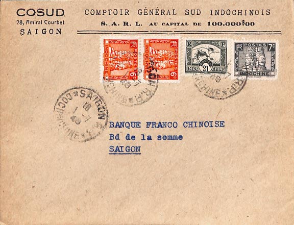 INDO1070 Lettre locale 1-7-1948 Affranchissement à 40c par 160 (x2) 160A, 164 Oblitération SAIGON * COCHINCHINE * : € 5