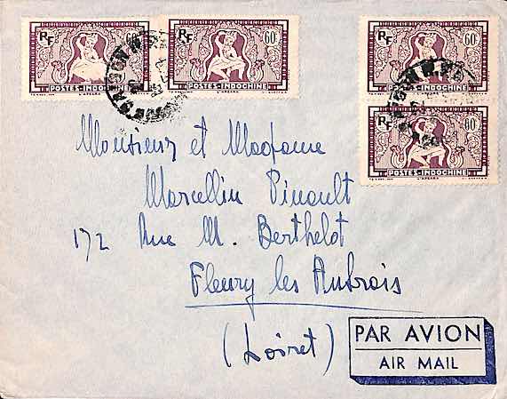 INDO722 Env. Avion pour la France 1949 Affr. a 2 $ 40 par 168 (x4) Tad SAIGON * COCHINCHINE * : € 6