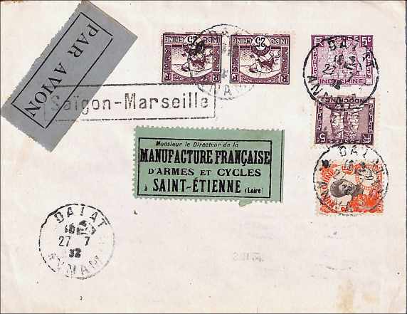 INDO1030 Lettre EP 5 c par avion pour la France 1932 Affranchissement 66 c avec 105, 165 (x2), 189 Oblitération DALAT ANNAM : € 15