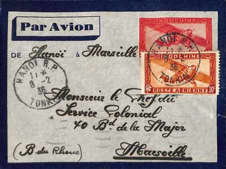 INDO1043 Lettre EP avion 36 c 1936 Affranchissement compl PA 7 (def.) Oblitération HANOI R.P. TONKIN : € 3