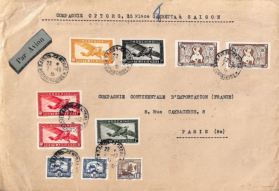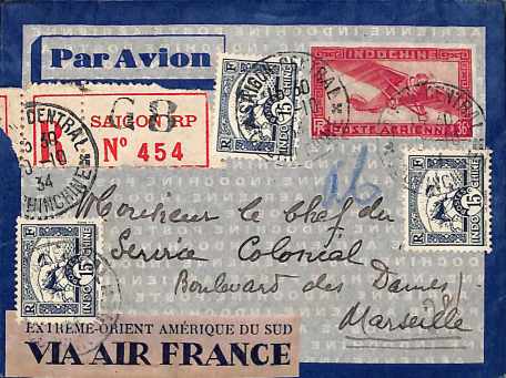 INDO1044 Lettre EP avion 36 c rec 1934 Affranchissement compl 162A (x3) Oblitération SAIGON-CENTRAL * COCHINCHINE * : € 8