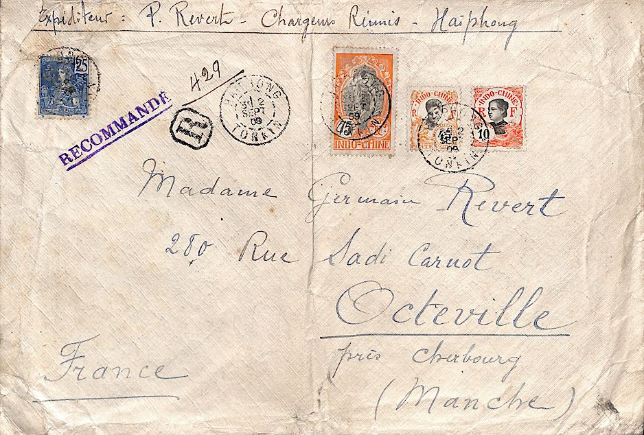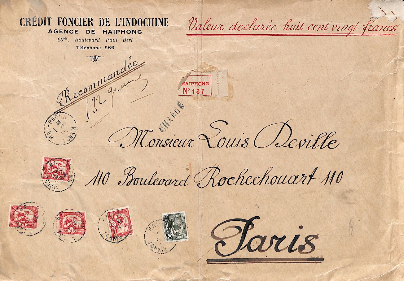 INDO0756 Devant de grande env (32 x 23) de valeur déclarée 1932 Affr 82 c Tad HAI-PHONG TONKIN : € 10