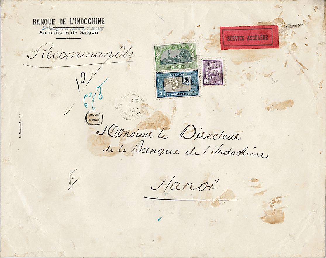 INDO1003 Grande env (28 x 22 mm) (pd) rec pour Hanoi 1929 Affr. 85 c. Tad SAIGON CENTRAL * COCHINCHINE * Etiquette rouge SERVICE ACCELERE : € 25