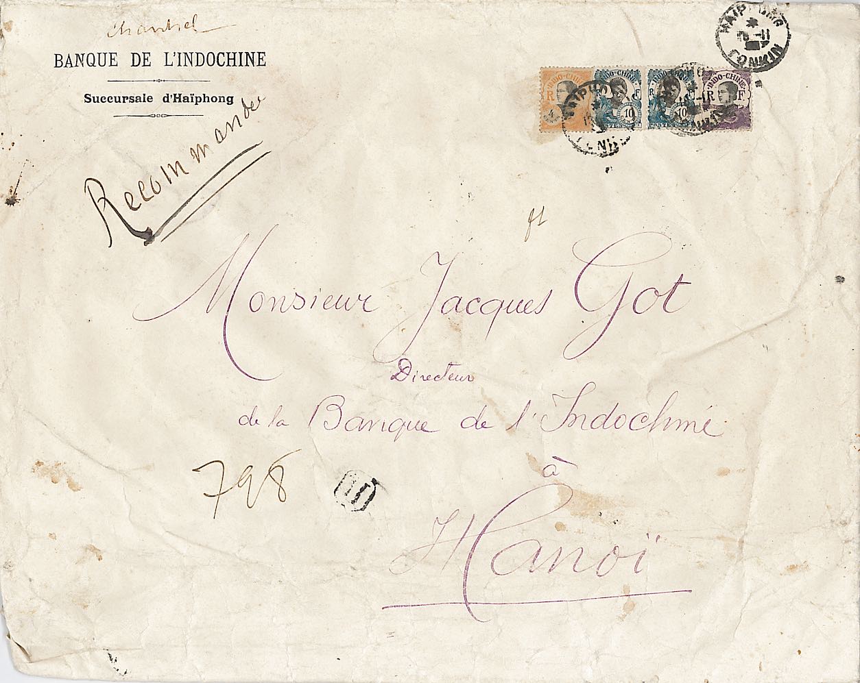 INDO1014 Grande env (32 x 24 mm) (def.) rec pour Hanoi 1928 Affr. 27 c. Tad HAIPHONG TONKIN : € 15